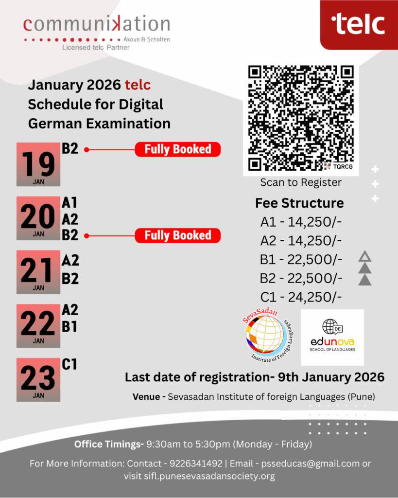 The registration can be done online using our → form* or personally at the Sevasadan Institute of Foreign Languages (CES Center für Germany, Pune).